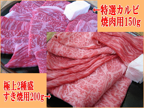 | 極上和牛ロースすき焼用100g 極上和牛モモすき焼用100g 特選カルビ焼肉用150g 焼肉のタレ・牛脂 ※吉野家の牛丼並盛で約80g ◆賞味期限 冷蔵⇒到着日より3日間 冷凍⇒到着日より20日間 ◆霜降り度:3.5 ◆柔らかい度:4 |